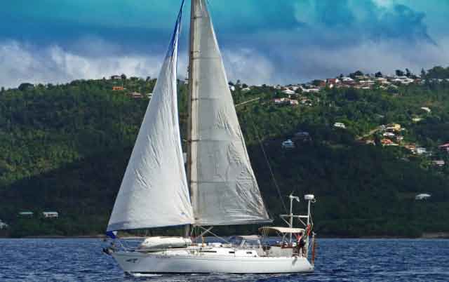 | When the weather finally settled in Martinique, we set sail for Dominica with Djarrka. The seas were still unsettled and the swell caused Ascension to rock n roll but we were sailing 7 to 8 knots consistently under full sail. |