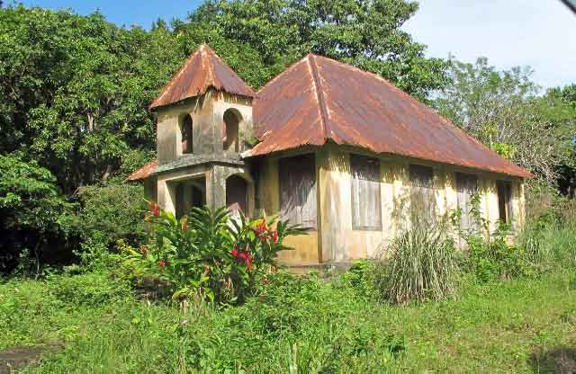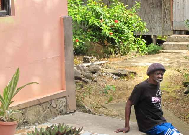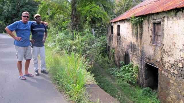 | Our guide explained a lot of the medicinal uses for the plants and trees as we drove through the tropical rainforest. He showed us his old schoolhouse, now abandoned. Along the road, an old rum factory, overgrown but its coral walls still perfectly intact. Our guide, Winston, posses with Gord. |