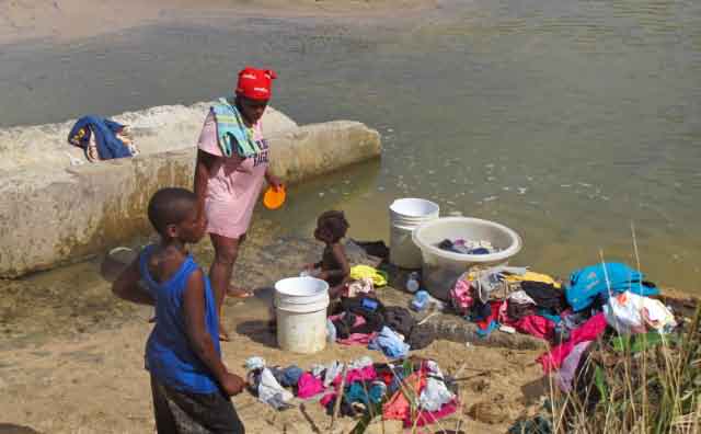 | We stopped at several beaches along the route. A family was using a creek flowing into the sea for laundry and bathing. |