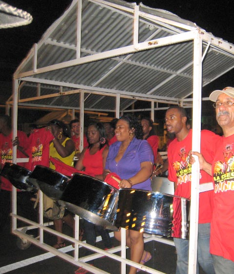 set up their pans and practice in the streets, pushing their