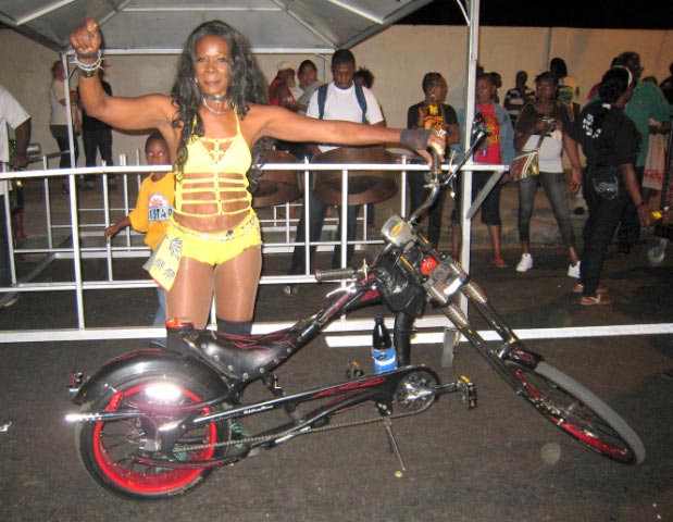 Everyone was into the beat of the pans. I love the old character (left) banging away on his rendition of a pan drum. A vivacious Lolita shows off her modified bike and other things! |
