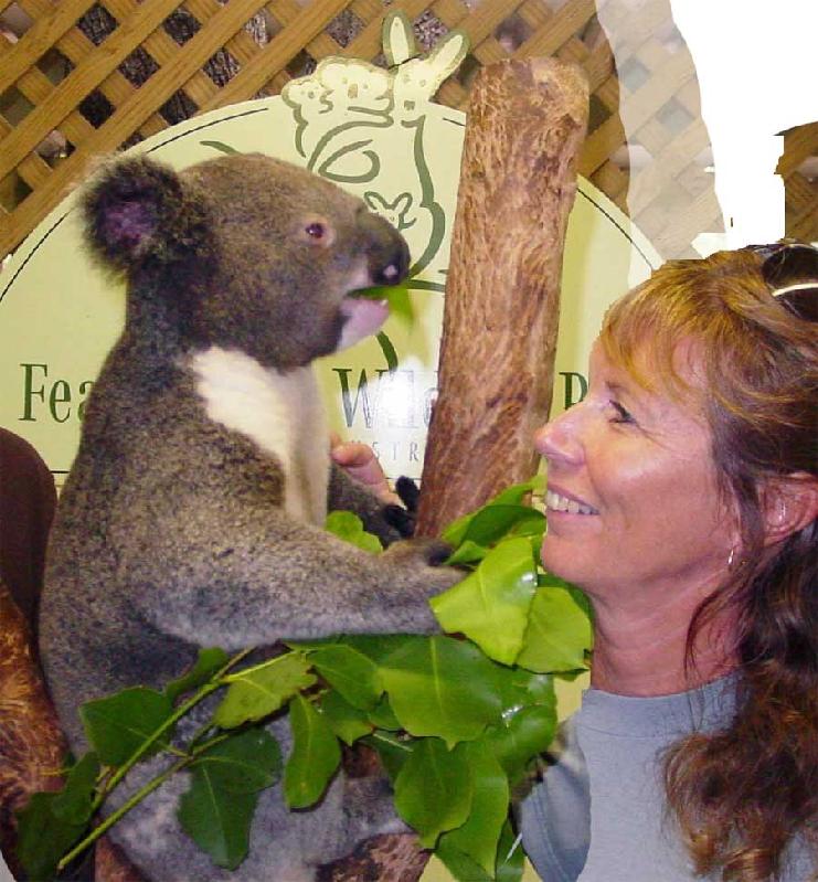 The Featherdale Wildlife Park is one of many Koala Bear Rescue Centres in Australia. There were an abundance of them sleepily hanging from gum trees. To our delight, a park guide removed a couple of bears from their perches and placed them where visitors could cuddle them and get pictures. The koala bears seemed totally oblivious to the activity but the guides were careful not to stress the animals too much and replaced them at intervals with other bears. |