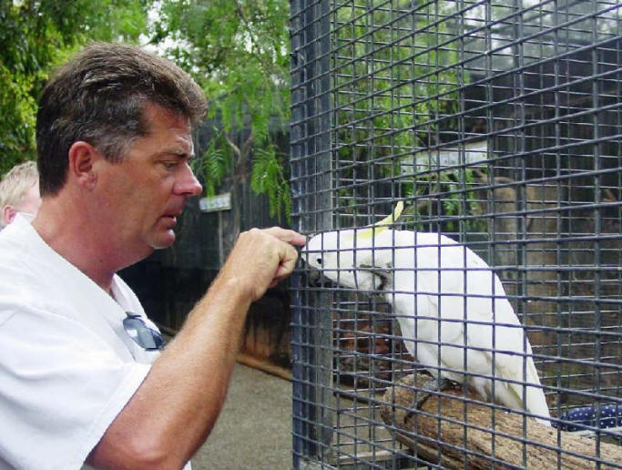 Gord got friendly with a Cockatoo, the same birds that we had been listening to making such a racket every night while preparing to roost in their trees. This guy loved to have his head scratched. |