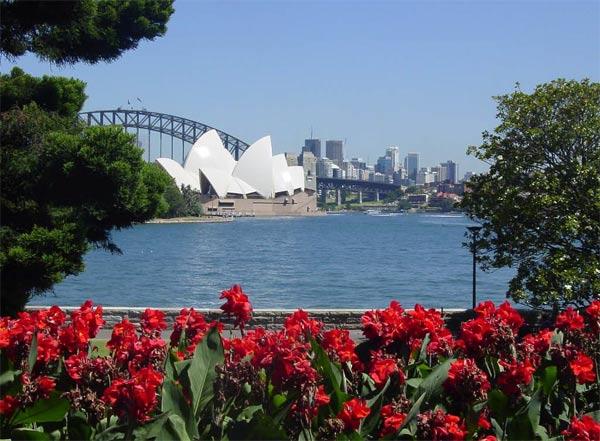 Royal Botanical Gardens We walked from our anchorage to downtown by way of the Botanical Gardens. The route took us through some residential areas, then past the commercial government docks where a number of war ships were berthed. The Botanical Gardens is a huge waterfront area with well tended flower beds, duck ponds and native birds. We followed the waterfront to Mrs Macquaries Chair, then around Farm Cove to the Opera House. |