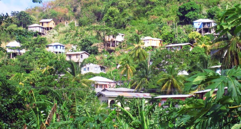 slopes of banana and cocoa plantations. Bright buildings painted in