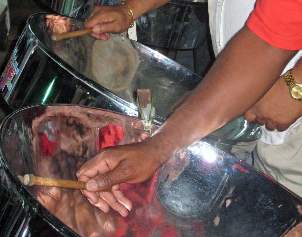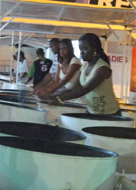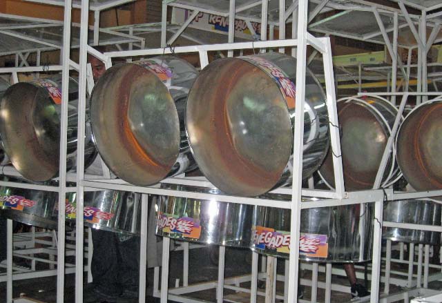 Beginning as a single "ping-pong" drum hanging around the neck playing a few notes, the Pans have evolved to cover the full western scale in bands topping 100 players. There are 3 types of Pan Bands. The small consist of up to 30 players, the medium Pan Bands have up to 80 and the large Pan Bands are know to have 120 players! It is amazing what a diverse and unique sound and variety of notes can be produced just by banging on the various sections of the pan, each pan carrying its own tune.