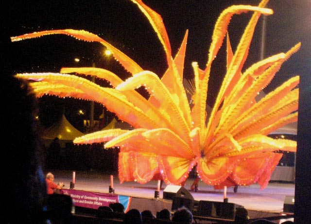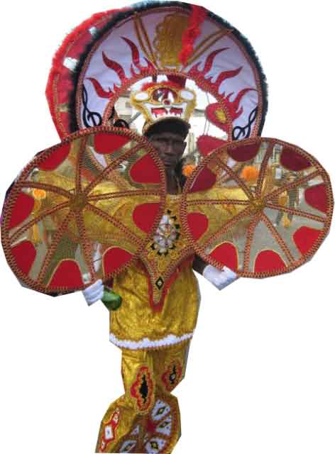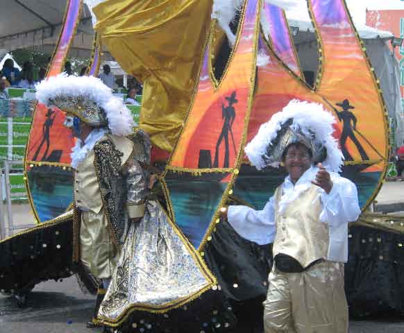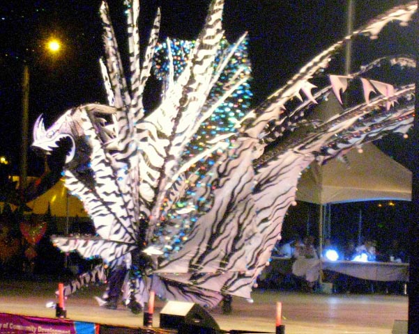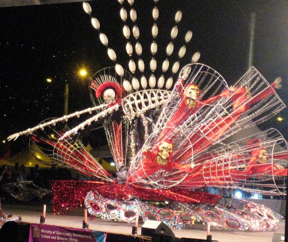 This show, held in the Savannah, displayed the contenders for the Carnival King and Queen finals. The floats were stunning and beyond description. The Kings and Queens are like moving artwork across the stage. The only limitation was that they had to not exceed 25 feet high because they would not fit under the overhead wires in the Parade Streets. Points were deducted if the max height was exceeded. Even with this restriction, several floats toppled over, despite the solid frame and wheels on the base. Simply too much for the grand King or Queen to manage, if only across the stage. |