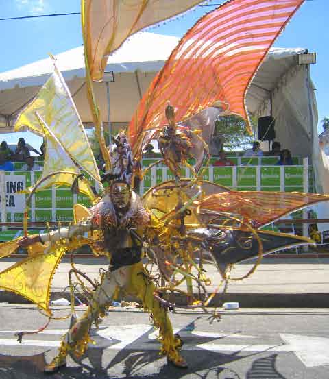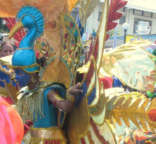 is the big day of judging on the streets, DJ music on the trucks, steelpan bands filling the tropical air with the latest calypsos'. Spectators cram the streets to see the costumes as the mas players prance and dancing in wild abandon, in all their glory of glittery spectacular costumes. |