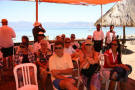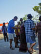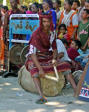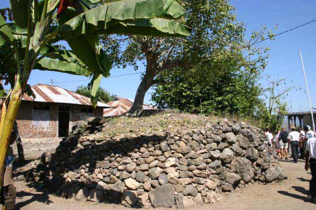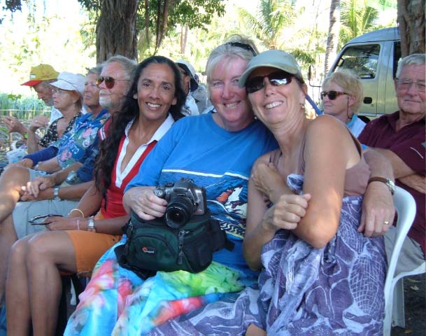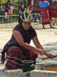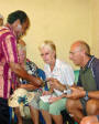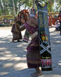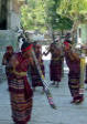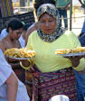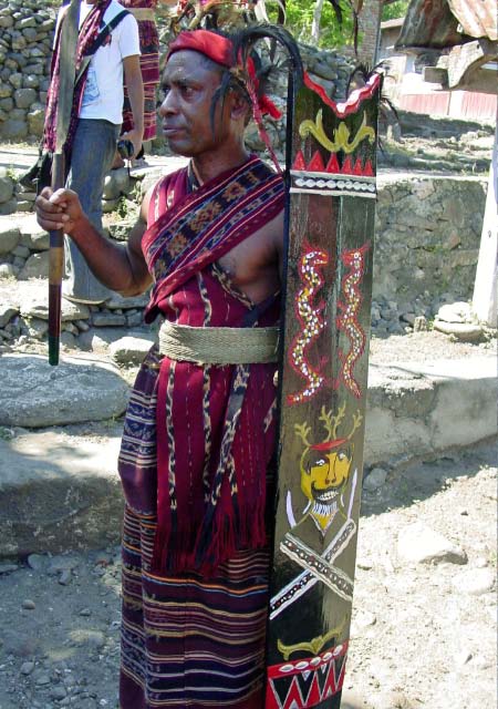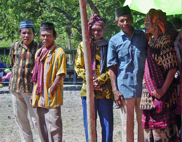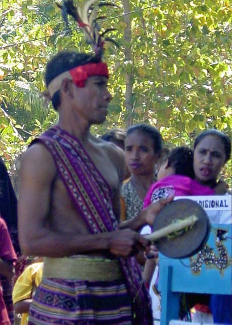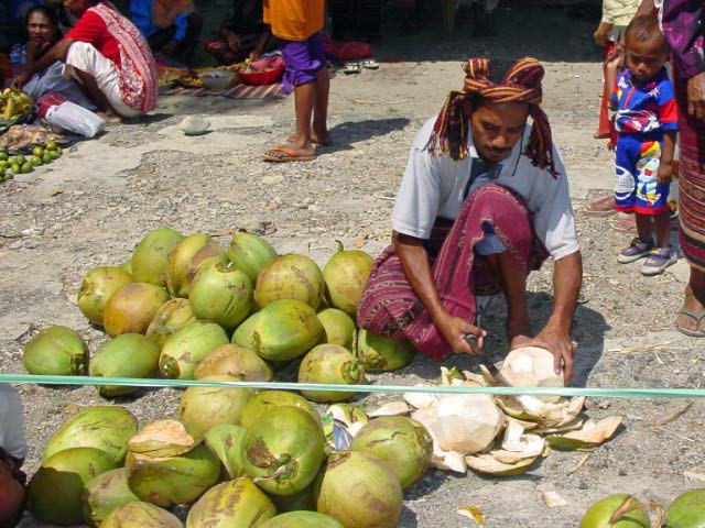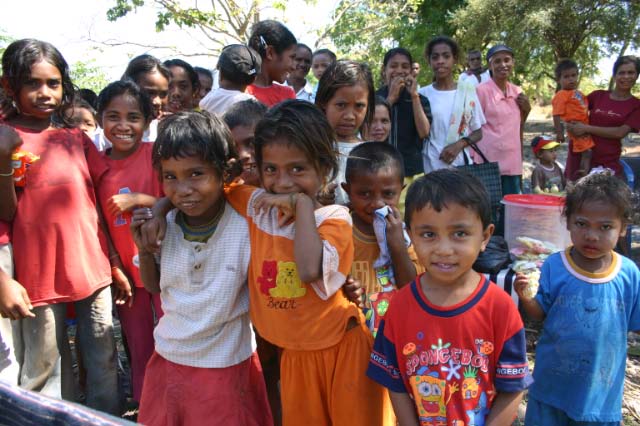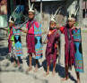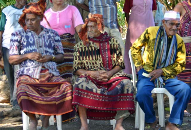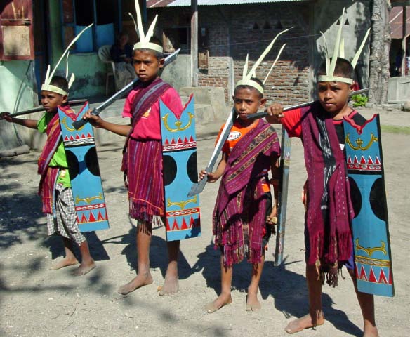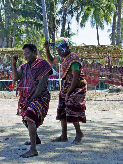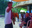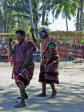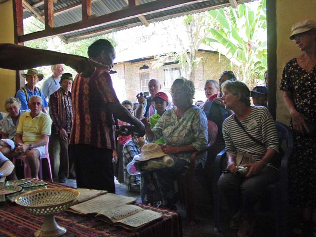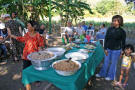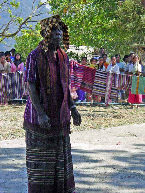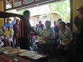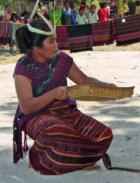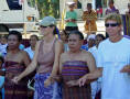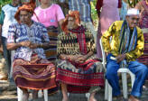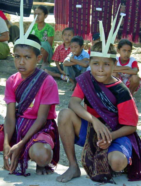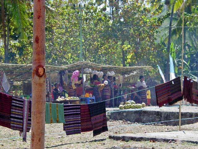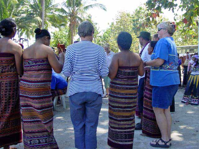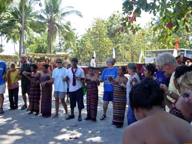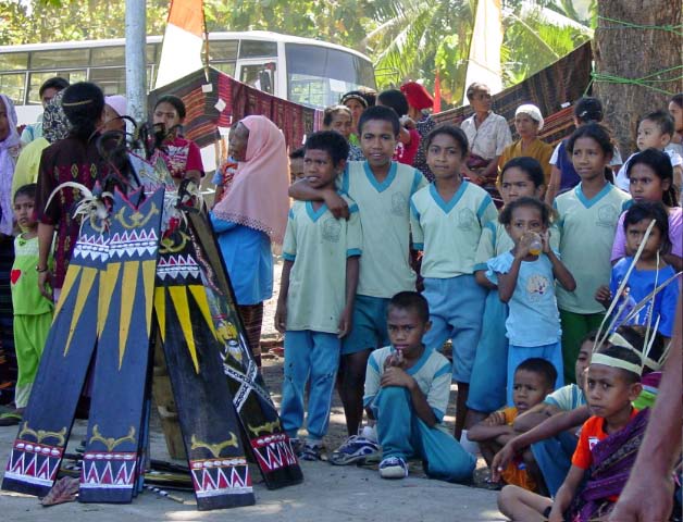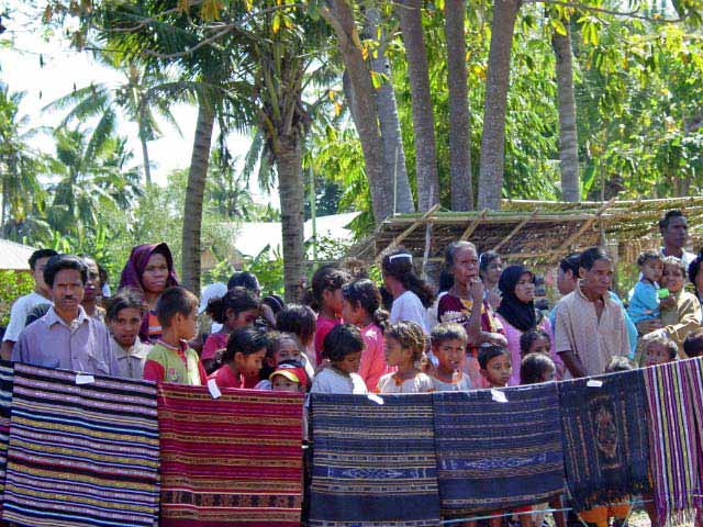 Back on the bus, we traveled a little further until we reached an area that was set up with craft tents, and an open area surrounded by hundreds of locals, mostly children, barricaded from us by an endless line of hanging Ikat weavings |  |  | We were seated for speeches and a performance of dance and song