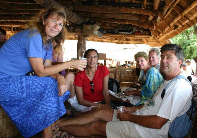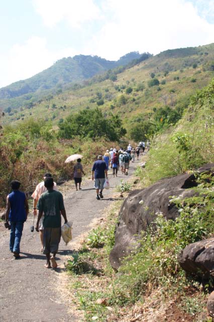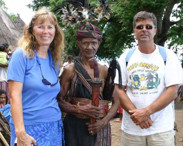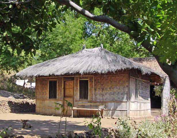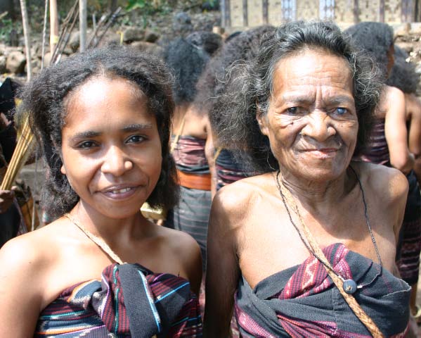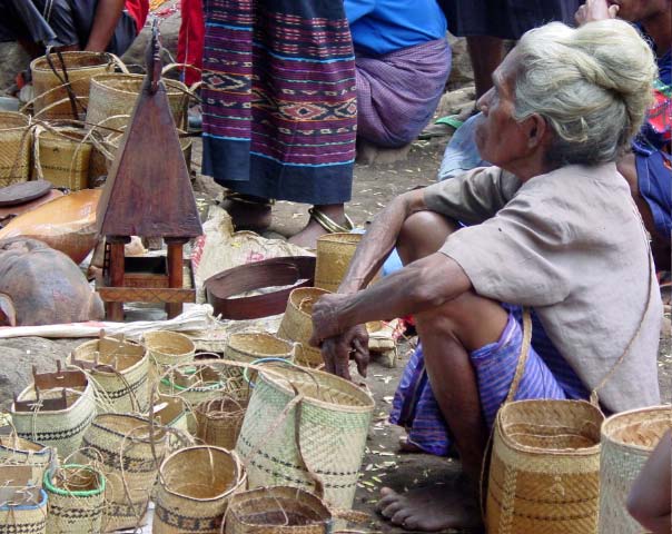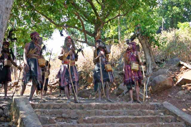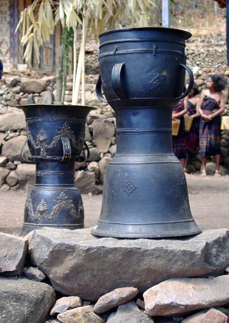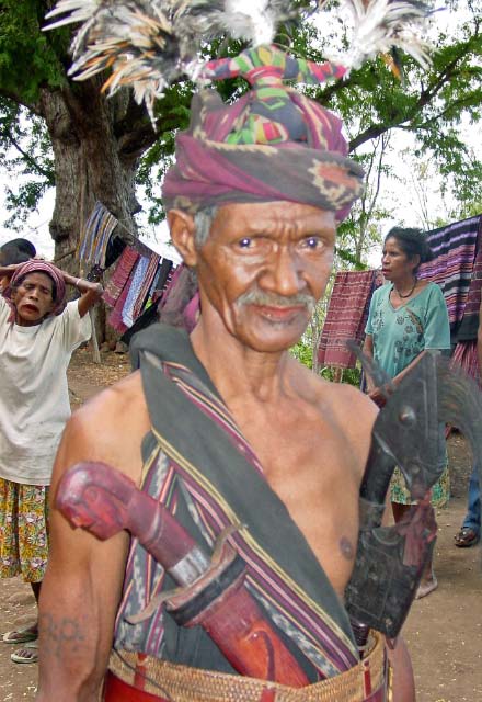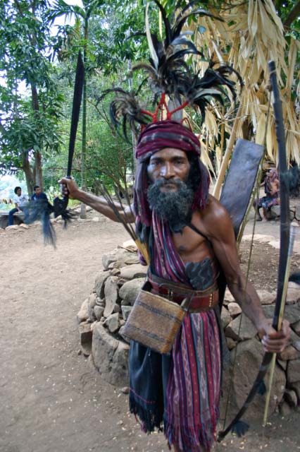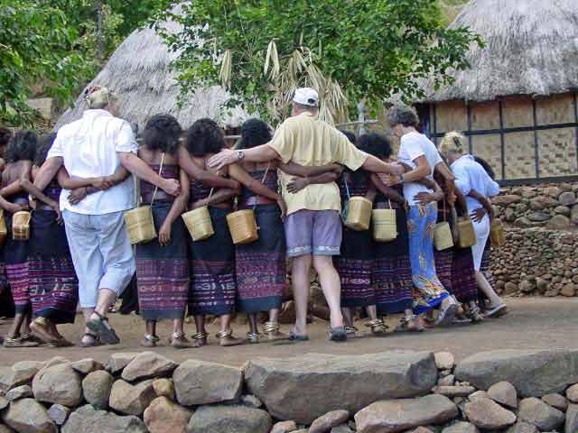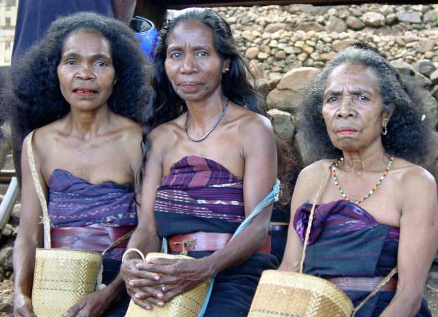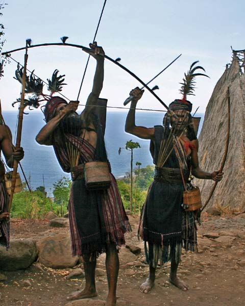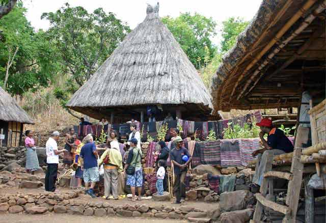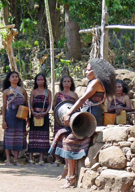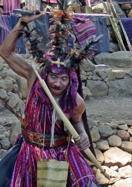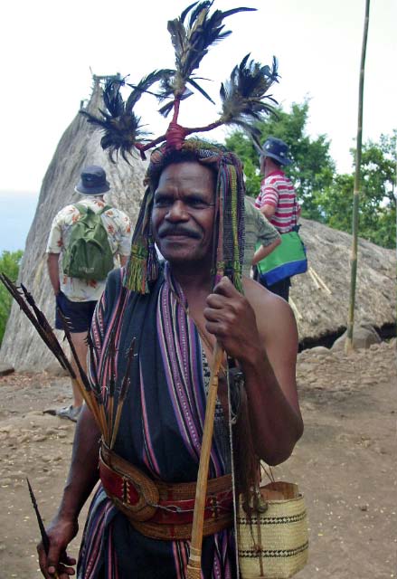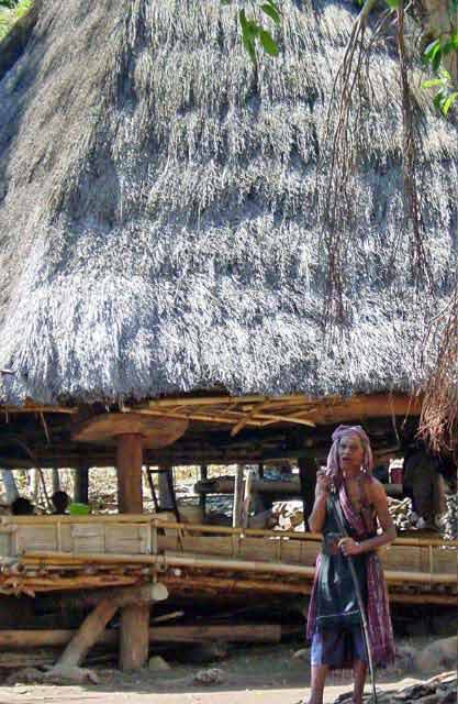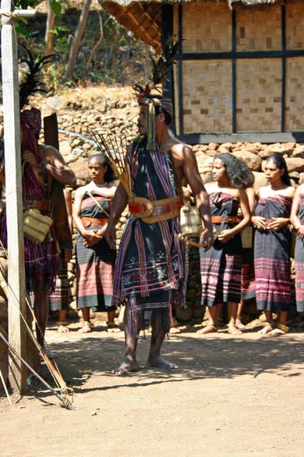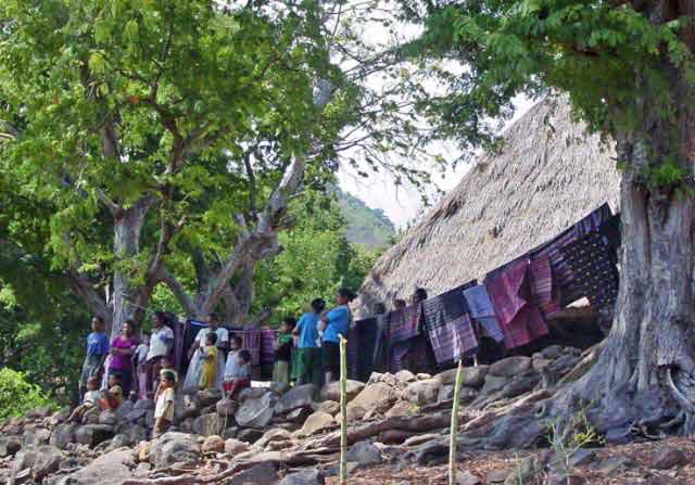 Suddenly a group of men dressed in traditional garb appeared to escort us to the village. Takpala Village Is one of the few catholic villages on Alor. It has about 15 traditional houses. The villagers were anxiously waiting for us, having decorated the surrounding grounds with hundreds of Ikat weavings. These were much different from the ones we saw in Timor, thinner fabric, brighter colors and more stripes. The village themselves do not weave ikat, but make baskets instead. |