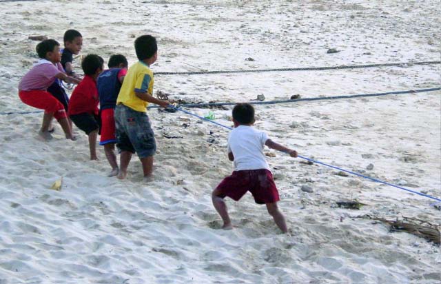 Along the beach, kids played tug of war, the universal game I guess. Annie joined in and the girls team scored an easy win! |