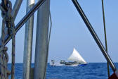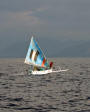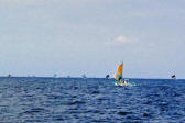 Sailing close to the coastline we were amazed at the thousands of canoes with outriggers that lined the shore, packed like in a tin of sardines, taking up every square inch of available beach and crammed side by side for miles and miles (see top photo right, background). Just before sunset, hundreds of these water spiders headed out to sea, crossing our path in a jig jag fashion and coming within inches of Ascension. They really do sail like they drive, no rules and with daring abandon. They would wave lackadaisically as they skimmed past our stern almost capturing our fishing line as we were desperately trying to retrieve it. Their primitive, holey polypropylene sails, ratty and torn, probably don't make maneuverability easy.