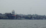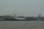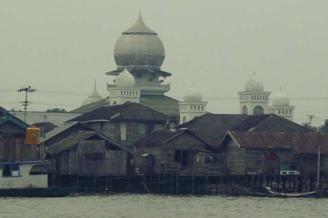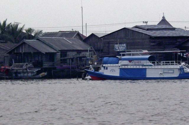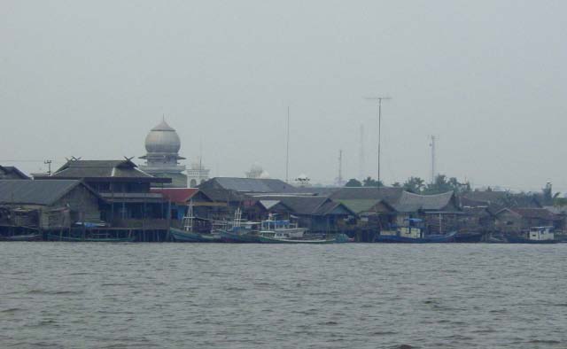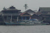 Kumai is a major fishing port and ubiquitous brightly colored seagoing vessels of all types were moored along the banks. We cruised by the port community and marveled at the ramshackle unpainted wooden houses on stilts clinging over the water, each with a fishing craft tied alongside rickety wharves fronting the river. |