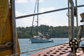 There were many interesting fishing craft coming and going from the anchorage. Many fishing boats had a different sail shape than we had seen before. We went over to investigate an unusual craft painted with wild abandon in multicolored psychedelic designs on the hull. They did not speak any English but were proud to show us the small shark that they had caught. |