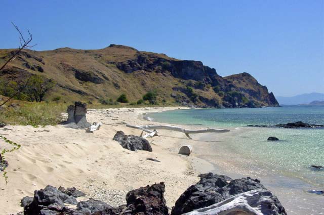 On our way to Rinca we investigated a little island where we snorkeled on a delightful reef. We went ashore and climbed a steep scrubby hill for a view of the anchorage. I walked the sandy beach and picked up a few shells.