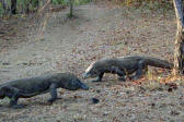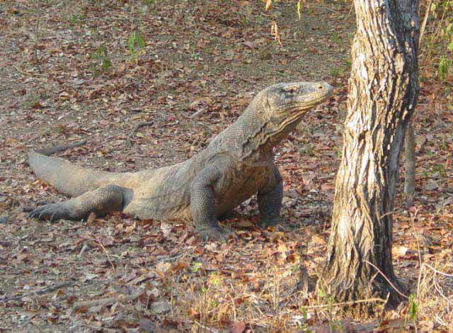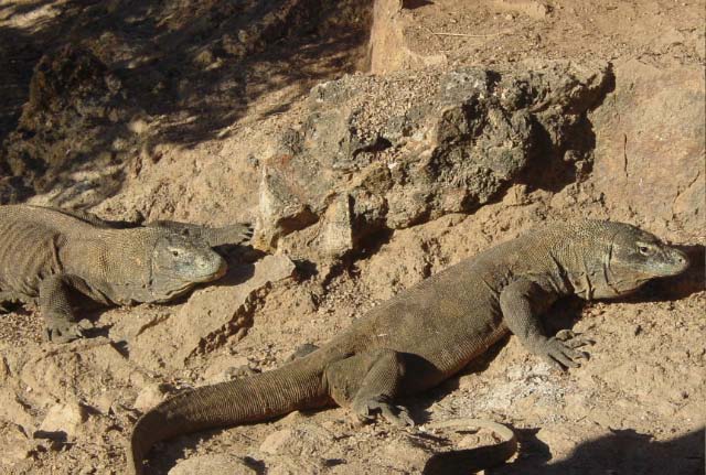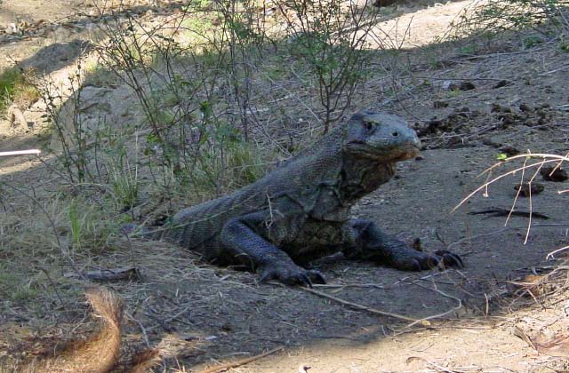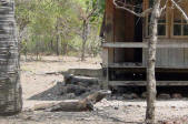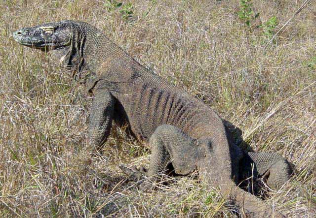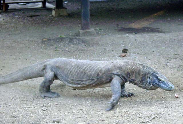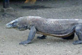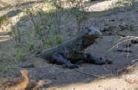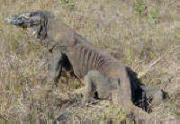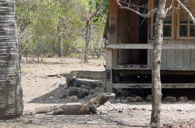 | The Komodo Dragon, actually a monitor lizard, known as "Ora" to the locals, may grow to 10 ft and weight 100 kg and can live for 50 years. They are predators; they lie and wait for their prey to stroll by and then bite. Many children in nearby villages have died as a result of the Komodo's bite and their houses are built on stilts to lessen the chance of an ambush. |
