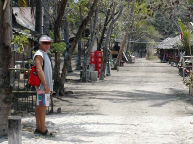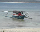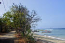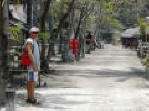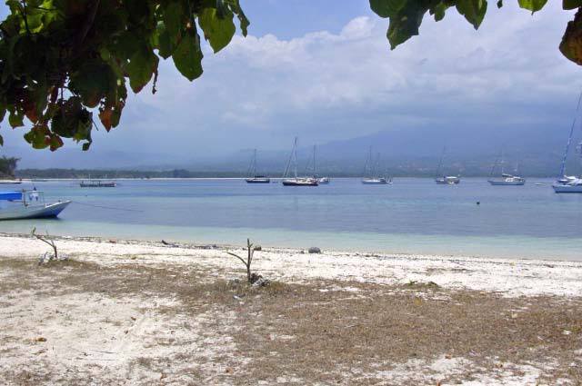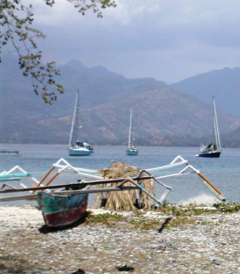 We anchored in a somewhat crowded bay and went ashore to visit Gili Air, a popular backpackers hangout. Landing our dinghies on the beach, we passed unique fishing craft and followed a sandy road. |