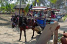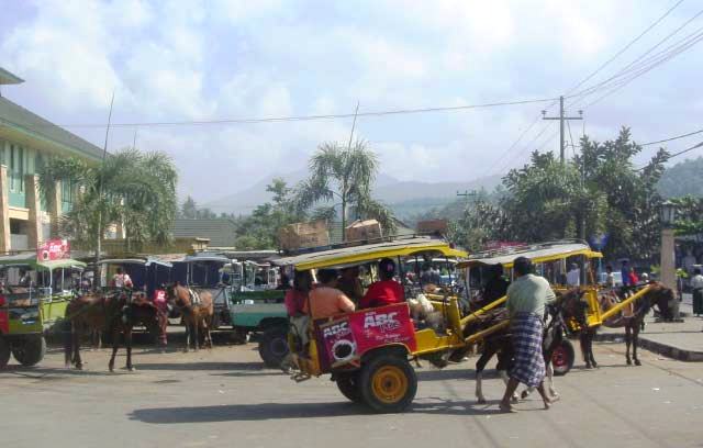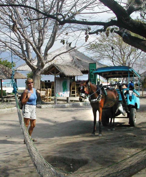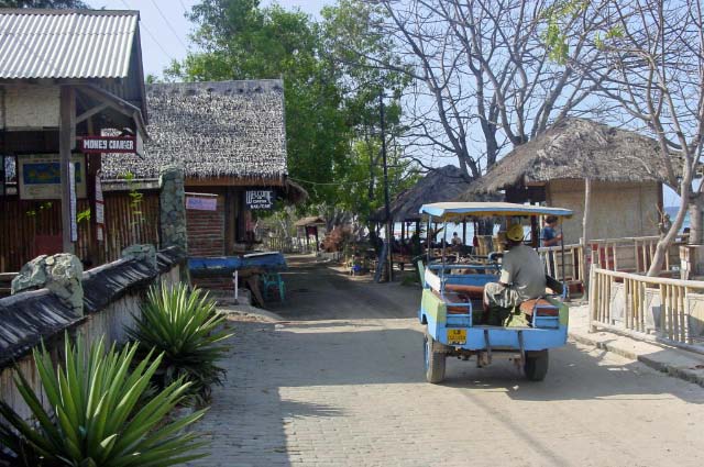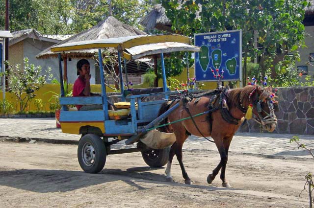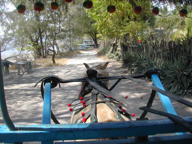 With its seaside narrow dirt and cobblestone streets, the only traffic was colorfully decorated pony carts and the occasional bicycle. The frail little Lombok ponies faithfully trotted up and down the road an infinite times each day, always available to take anyone anywhere you needed to go. |