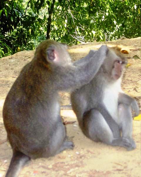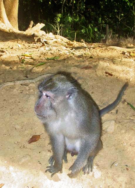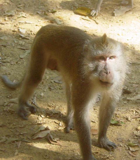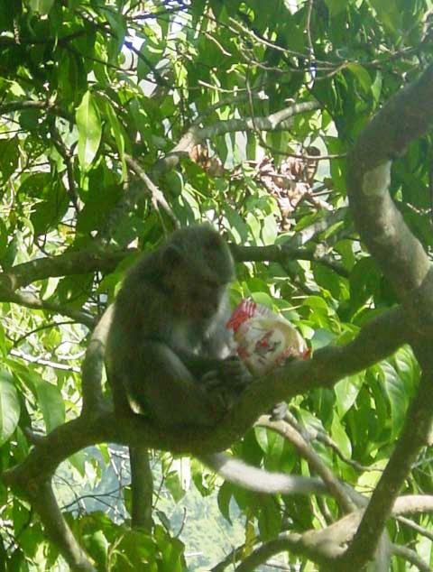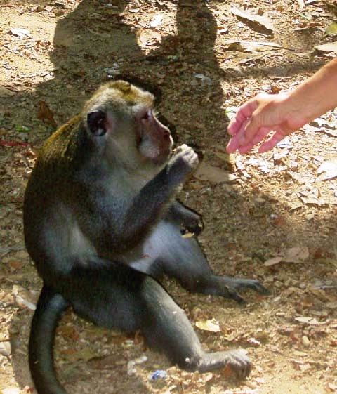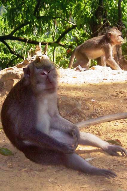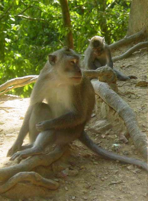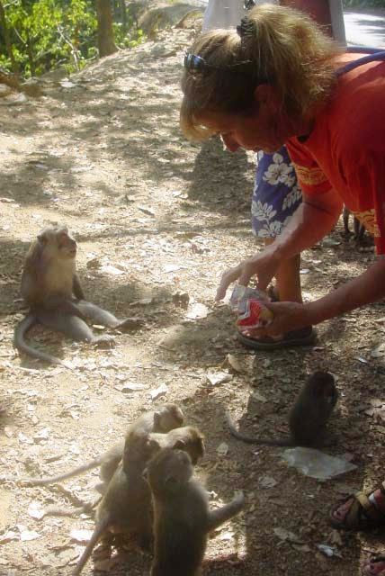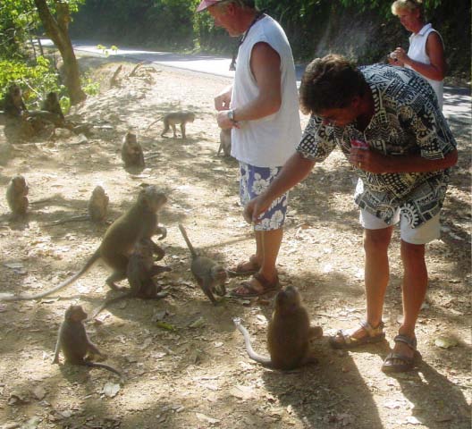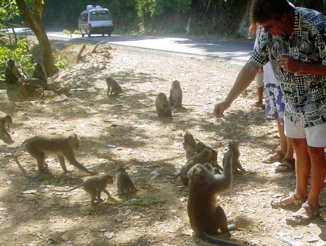 We pulled off the road and, as if on cue, monkeys appeared all around us, obviously expecting peanuts. Our guide supplied us with treats for the monkeys. |