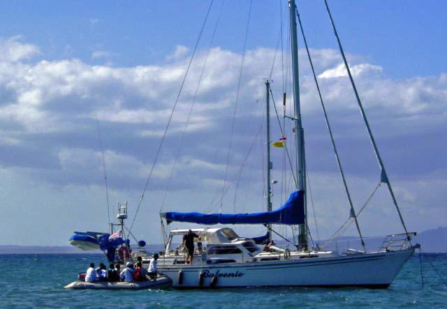 Although we arrived in the anchorage about 7 am we waited all day for clearance. It was a SLOW process as the officials took 30-60 minutes per yacht and there were 100 yachts that needed to be checked in. We watched the rubber ducky circulating and overflowing with officials move from boat to boat, always missing us as they returned every hour to the beach for a break. It was reported that the officials were seasick, understandably as the boats were all rockin and rollin, so they needed to exchange crews regularly.