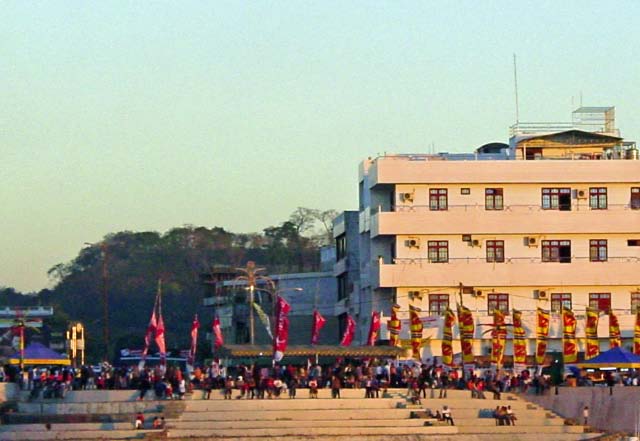 Our supper was delicious and we were joined by several locals who practiced their English and provided friendly information about the city. Finally it was time to make our way back toward the boats but despite numerous attempts, there was no way to penetrate the steady stream of traffic and get across the street! There are no intersections or lights, no one stops for pedestrians and there is never a break in the colorful blinking lights of the bemos and motorbikes. Finally Annie approached a policeman who stopped the traffic, long enough for us all to scurry across the street.