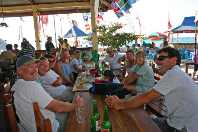 We strolled to the colorful Teddy's Bar where we were given more handouts, T-shirts, hats, etc. and approached by friendly locals offering to arrange tours, fuel, transport and conversation.