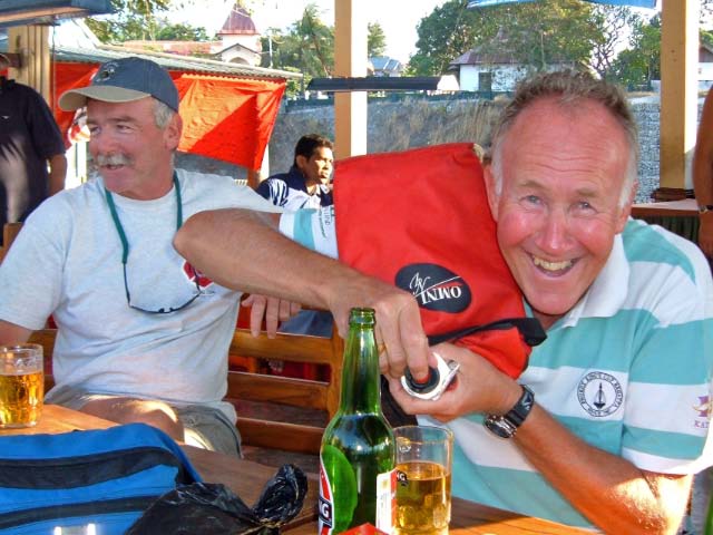 Finally at 4 pm, our turn came. In typical Indonesian style, there was no order to the process and the procedure involved an assembly of 11 officials clambering onto the boat, which included customs, immigration, quarantine, harbor control, navy, police and all their relatives! all curious about seeing the yachts. They all tended to linger and explore all the drawers and lockers of each boat, hinting at "presents," wanting whiskey (I only gave them juice), and eating chocolate cookies, which they devoured. I had to remember NOT to use my left hand because in Indonesia that is reserved for the toilet (which I will discuss later). The people were