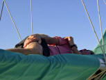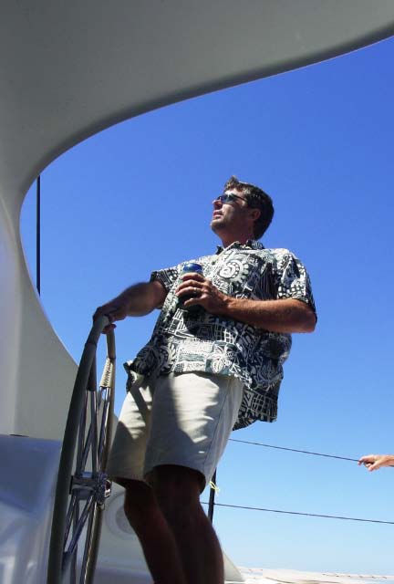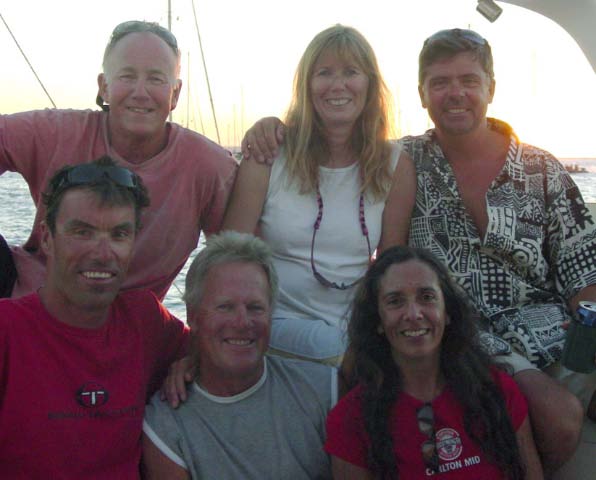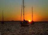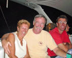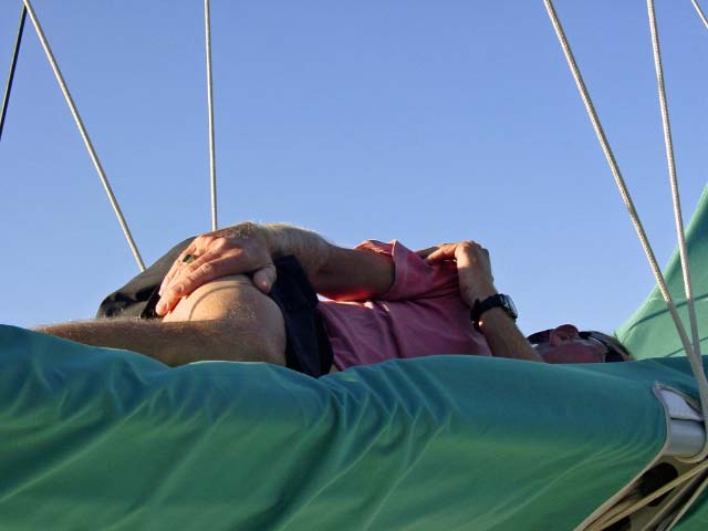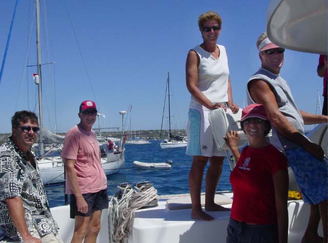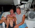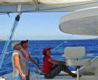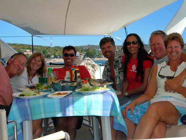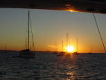 | We had a great BBQ of fish, sausages, meat patties, salad and veggies, and of course lots of beverages. We danced on the foredeck until Tony (Tactical Directions), worn out, fell asleep on the boom. Our party carried on until sharp ugly rocks began to immerge in the water around us as the tide dropped, so it was time to return to the anchorage. Tony remained sound asleep on the boom until after we had set the hook again! |