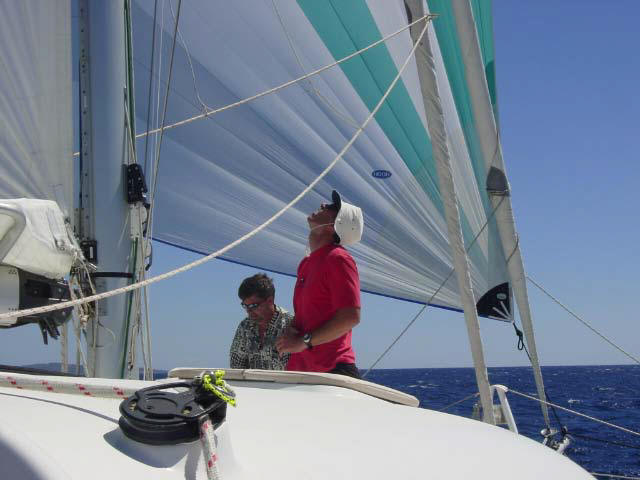 Since Gone with the Wind was having problems with their new spinnaker Liam invited us for a sail to an outer island to check it out. We had never sailed on a Catamaran before, let alone a 52 foot one so jumped at the chance. We also needed to practice sailing that boat as we are committed to crew on Gone with the Wind in the King’s Cup Race in Phuket the beginning of December!