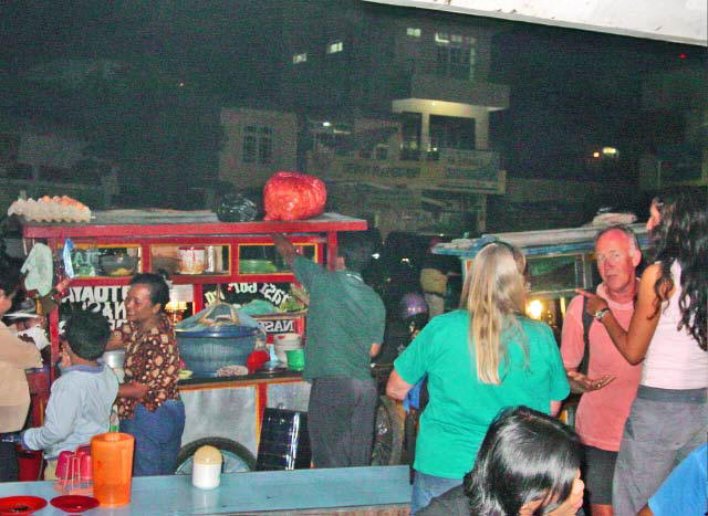 We finally got ourselves organized to head to shore for dinner. We returned to our favorite hangout, where the food carts were set up around the bus depot. We had a noodle type dish called Sori, which was very good and great value at 5000 rupiah (60 cents).