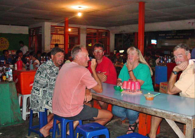 On the way back we stopped at the stage where there was another band playing and more dancing. It was very late when we finally returned to the boats but we needed to stop and let Gone with the Wind know that we had a tour planned for 5am! Liam was in the process of hoisting his dinghy and it was evident that he had too many Bintangs on shore, so Gord gave him some assistance. The news of our tour beginning at 0:dark00 was not welcome information and he tried his best to decline participation in the reservation.