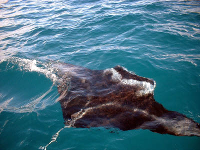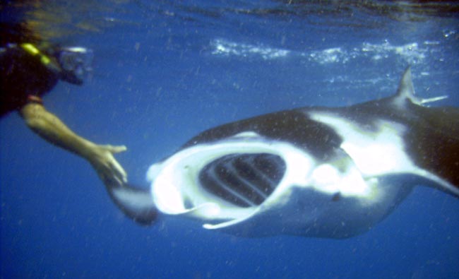 May 2, 2004 Snorkeling in the neighboring bay was wonderful and we made several trips to visit all the colorful fish. Every morning a large group of Manta Rays frolicked beside the boats and so everyone jumped in the water to play with them. They were totally unconcerned with our presence and let us get close enough to touch. | |