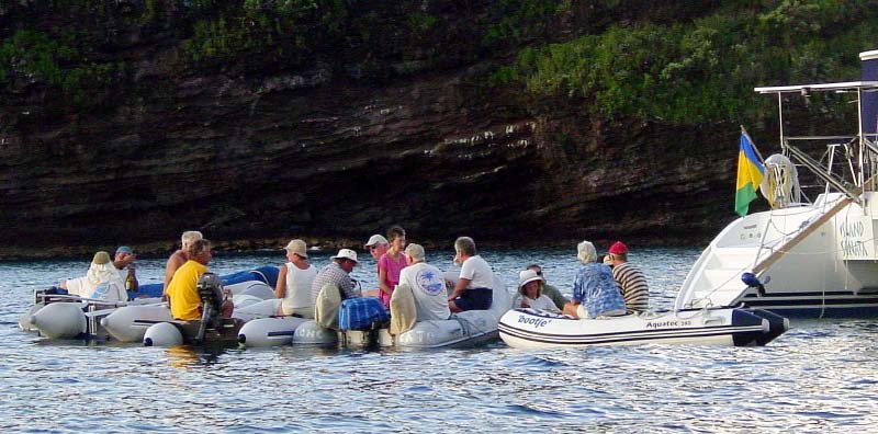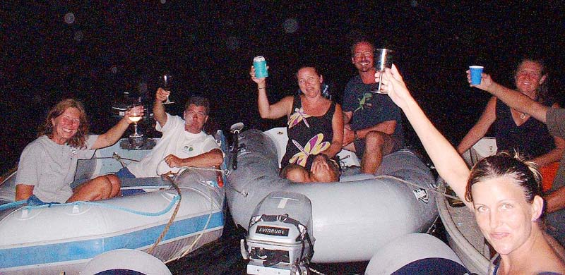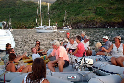 May 1, 2004 There were lots of cruisers from our fleet anchored in the bay. We had a dinghy raft-up party one evening to get reacquainted with everyone we hadn't seen over the past month due to the passage. We mostly partied in the rain throughout the evening but nobody really cared. Some of our cruising companions included Emerald, Ocean Girl, Billabong, Island Sonata, Whisper, Matarua, & Solstice. | |