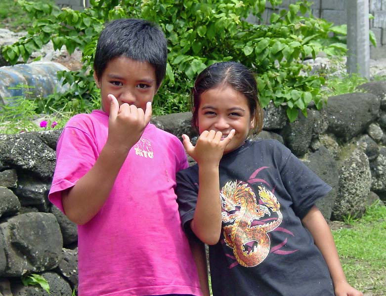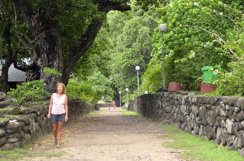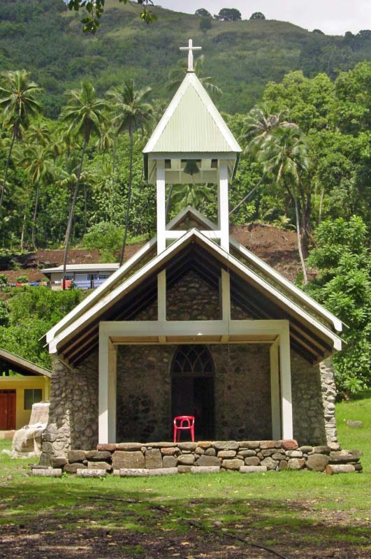 Baie Hanatefau May 5 Great news! We made it back to Atuona and after a couple of trips to town we managed to track down the motor and pick it up. Gord sat in the cockpit and just hugged it for awhile, then we celebrated. It was such a relief that the motor arrived safe and sound after so many complications. We sailed back to Tahuata to spend a night anchored in Baie Hanatefau before heading to Ua Poa. The beautiful bay (top pics) is uninhabited and although well protected from swell, there were lots of bugs. Notice our boatful of bananas that we got from Felix in Hiva Oa. The nearby village of Hapatoni is a quaint quiet town, clean and tree lined. The locals waved as we walked by and the children were especially friendly. As with every tiny village, there was an interesting stone church in the center of town. From Hanatefau we continued on to the island of Ua Poa. | ||