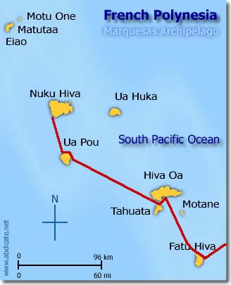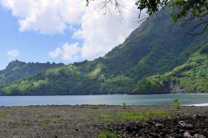 From Hiva Oa, it was an extremely difficult process that left Gord's hands blistered and swollen and his back in very bad shape but we managed to get the anchors up and joined our friends in a beautiful anchorage on Tahuata Island. The first thing I did when we got here was jump into the warm clear water. Tahuata Island lies south of Hiva Oa. The centre of the island is a mountain chain, radiating out in steep ridges and valleys to the coast. The population of the island is 600. Is is very beautiful here, uninhabited and relaxing so we decided to stay for a week or so then head back to Atuona to pick up our part. |