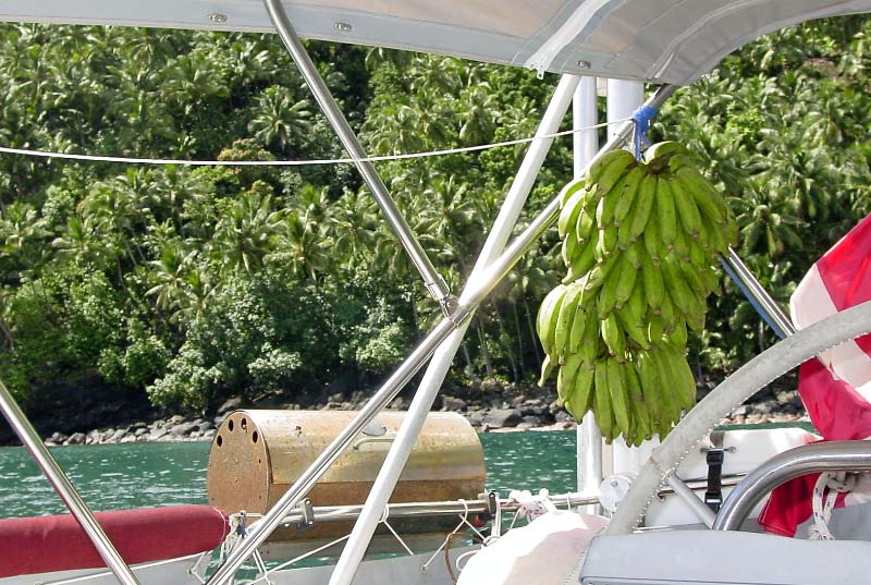It poured down rain for 2 days with very high winds so we were sooo glad to be tucked into the anchorage in Tahuata. After all the rain, the bay was full of mud and debris so no more snorkeling or swimming to cool off. Even with the rain it was 85 degrees and like a sauna in the cabin. In the midst of one of the squalls, Sowelu, making his landfall from PV, called for help so Gord and Ralph from Ocean Girl ventured out into the driving rain in the dinghy to try and find him. The visibility was very poor and they were gone most of the day so I was worried they wouldn't find Sowelu and wouldn't be able to find their way back to the anchorage. Sowelu had just arrived in Marequesas but when trying to get into Atuona to check in, his motor died. So he tried to sail for Tahuata in the squally winds and heavy rain. When he got within a mile, his halyard broke and he couldn't bring down the main. So he called for help. Gord and Ralph found him eventually and boarded his boat and got him into the anchorage safely. Mia, on Sowelu is a seamstress with 2 sewing machines on board, and she repaired our spinnaker in return for the help. We waited in Tahuata for the weather to clear before heading back into Hiva Oa to take care of the paperwork required to obtain our windlass. |