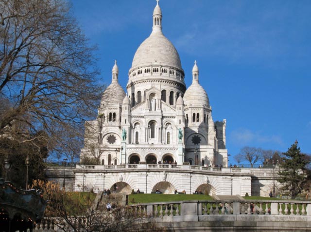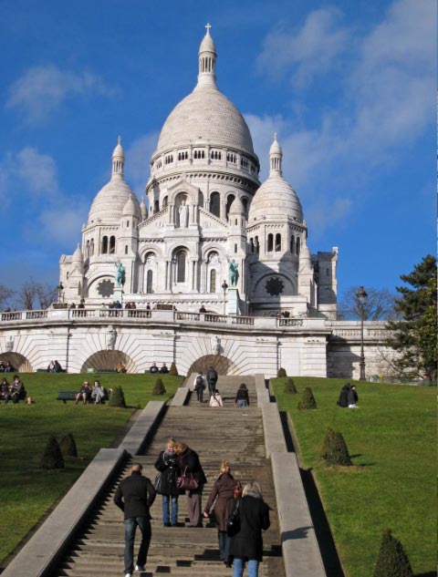 Sacre Coeur Rising above Montmartre with its unmistakeable white dome, the Sacre Coeur sits at the highest point of Paris. This basilica, which was consecrated in 1909, is best-known for its gold mosaic interiors and for its dramatic terrace, from which we got a sweeping view of Paris. |