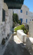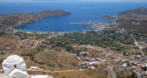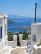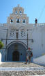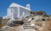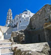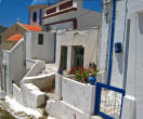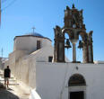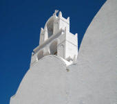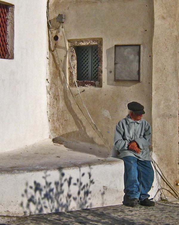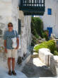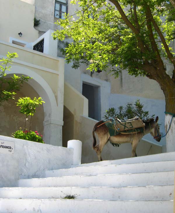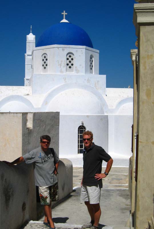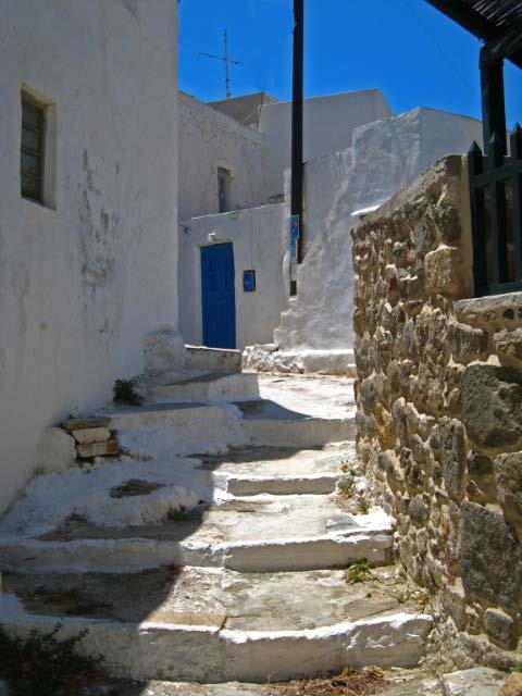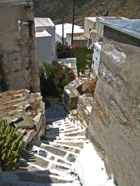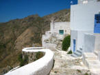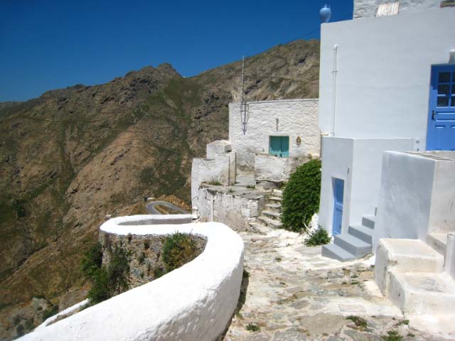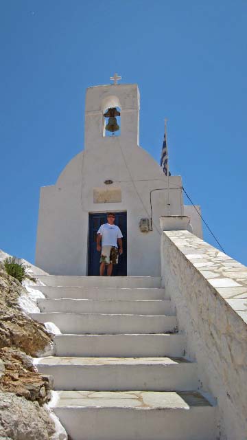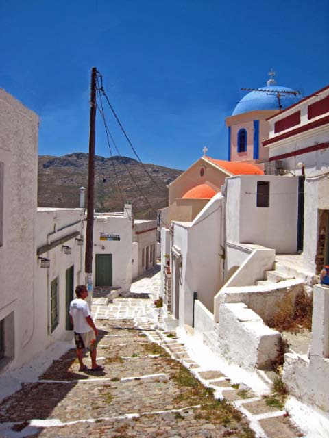 Hora The following morning we hopped aboard a bus that took us to the top of the hill at Hora. Clinging to a crag high above Livadi a tranquil white washed village seemed to be all but abandoned. Apparently, all the young people migrate to Athens, leaving a declining population in the sleepy village. The wondrous maze of streets led upward to a town square, where we joined Argos for a cup of cappuccino. |