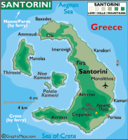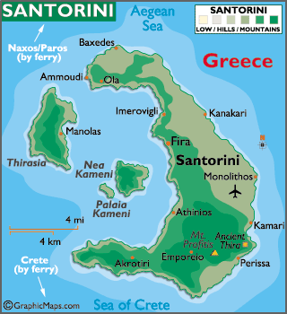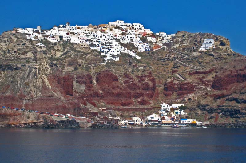 The ferry ride was interesting as we passed islands and make a quick stop at Ios. It took about 2 hours to reach Fira harbor. The sight of the dramatic whitewashed village spilling down the red rock like icing on a cake took my breath away! From the boat we were awed by the spectacular views of the cliffs and their multicolored strata of lava and pumice. The submerged caldera is a vestige of what was probably the biggest volcanic eruption in recorded history. Volcanic eruptions have been so violent throughout the centuries that they have changed the shape of Santorini Islands many times. |