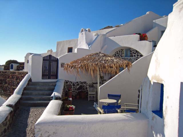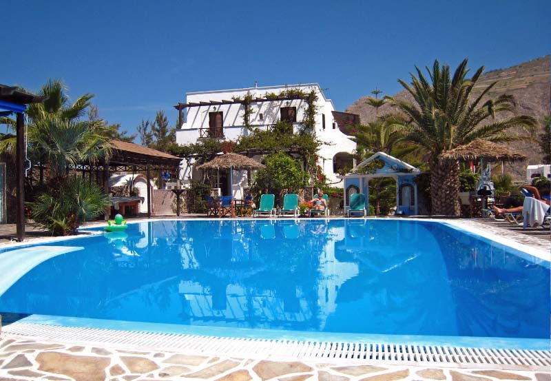 We made out way to a tourist information booth where we booked a hotel near the beach of Perissa at the north end of the island. Prices in this area were considerable cheaper and we organized a rental car at the dock as well. Within 1/2 hour we were on our way to find our accommodation. We arrived at the Paradise Beach Hotel and were pleasantly surprised. The hotel was charming, with a bar next to the swimming pool, breakfast included, and spacious clean rooms, all for $30/night (double). Merissa Beach was a hopping but casual resort area only minutes away where there were bars and restaurants galore. |