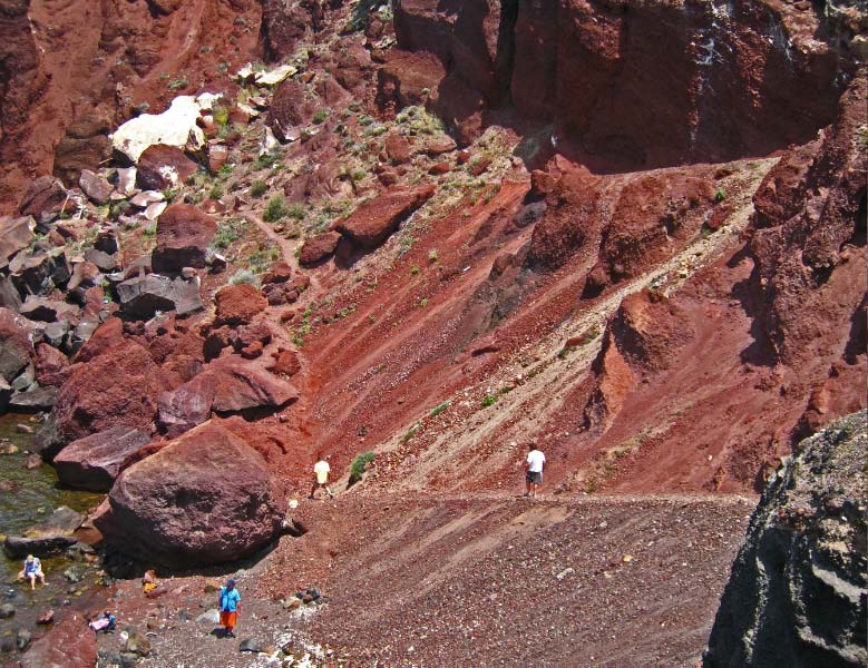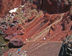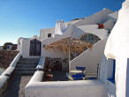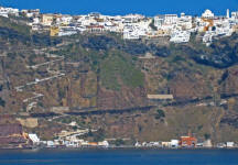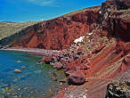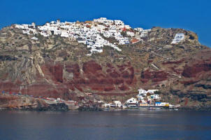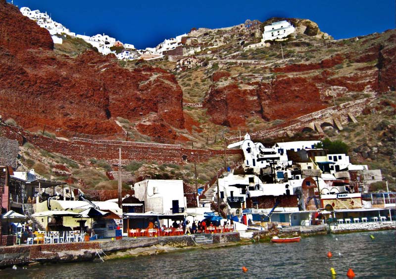 Ammoudi 300 Steps below Oia, lies the tiny fishing harbor of Ammoudi. Sheer cliffs of red volcanic rock and layers of white pumice and black lava rock make for a spectacular vista. |