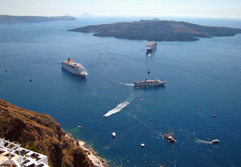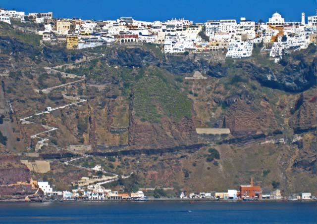 There were 3 cruise ships in port, standing off in the deep water below Fira.. We tried to avoid the tours and crowds from the cruise ships but found it impossibly crowded in the narrow streets so opted to leave the magical area of Fira, to return when the crowds thinned later. |