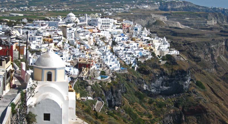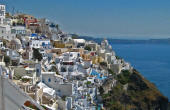 Fira Although Fira is the commercial district, it retains a dramatic aura. We walked around the pedestrian alleyways on the edge of the caldera for the spectacular views of the moulded villas clinging to the side of the strata layered rock. |