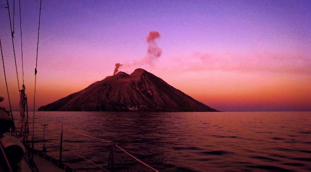 Stromboli - The Oldest Lighthouse in the World Stromboli, one of the most active volcanoes on the planet, one that's erupted almost continuously for the last 2,000 years. And yet, over 500 brave souls still live on this time bomb. The weather was very settled and we were able to sail around close to Stromboli watching the volcano burp and spew red lava like a great fireworks display into the black sky, then the rocks tumbled down the mountain and splashed into the water with a thunderous sizzle. We spent several hours mesmerized. |