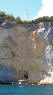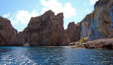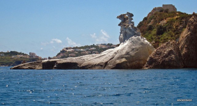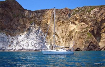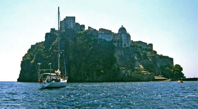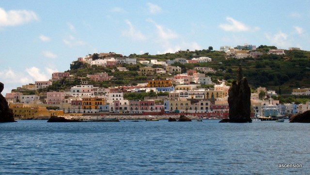 June 25 We left Procida at 6 am, with steep short waves stopping us short and a NW wind on our nose. We were tempted to turn back but could not face the prospect of another night at the rolly anchorage so we persevered. Eventually the wind died and we were forced to motor for several hours. The seas did flatten somewhat to about 1 meter and eventually the wind filled in and we turned off the motor. A few minutes later, I went below and found myself ankle deep in water!!! We're sinking! Gord rushed below and ripped up the sodden floorboards before discovering that water was pouring in through the shaft packing. This had happened once before, the cause completely unknown, but he quickly got the leak stopped. The electric and the manual bilge pump were put into action and I spent the following couple of hours bailing out the bilge. When we got anchored I would need to get all the salt water out of everything stored under the floorboards, but for now, we were happy that the crisis was abated. We continued to sail, close hauled and sometimes on our ear, tacking toward our destination of Ventotene, some 27 miles away. We are fortunate that Ascension is able to sail upwind, otherwise we would not have been able to make our course, although we did have to tack, sailing about twice the distance to our waypoint. The rocky small island of Ventotene was within our sights around 2:30 pm and we made the decision to continue sailing (such a rarity it seems in the Med) rather than risk running out of wind and having to motor by waiting until the following day to continue on. |