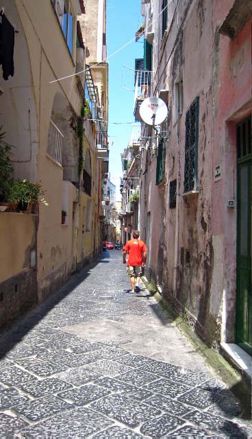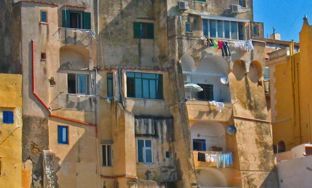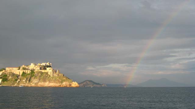 June 22 At midnight we awoke to things not sounding quite right and the moon was coming in the wrong window. Although uncomfortable, the anchorage was fairly well protected and probably the best in the area for shelter from the northerlies. But an unforecasted wind switch was bringing us gusts from the south putting us on a lee shore. In addition to that unsettling night, it blew hard several days but one night in particular put the anchor to the test as we held fast through high winds with gusts recorded on the knotmeter at 53 knots! We were wanting to move on but the wind persisted for days. With wind changing direction faster than we could pick an anchorage, we anchored in several spots on Procida. We checked out the small marina at Chiaiolella but they would not budge on their 60 Euro/night quote.
