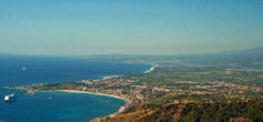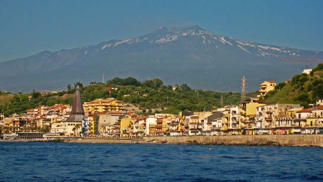 Taormina Roads We made landfall in Sicily, Italy at Taormina Roads (37.50.75N 15.17 E). As we entered the bay, we were immediately approached by the "keeper" of the mooring buoys who offered to let us tie up to one for a mere 30 Euros per night! We politely declined and dropped our hook less than 50 meters away, good holding, same water, same scenery, but for free! In our opinion, this was the most beautiful anchorage on the east coast of Sicily, under the majestic smoking Mt Etna with with packed clusters of washed pastel and ochre colored Venetian houses spilling down the surrounding cliffsides. Train tracks followed the coast, jammed between the cliffs and the water and there was no end to the trains, passenger, freight, tankers, day trains and the like, all day long. |