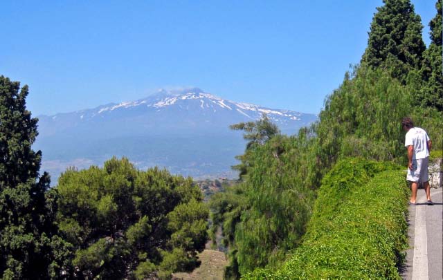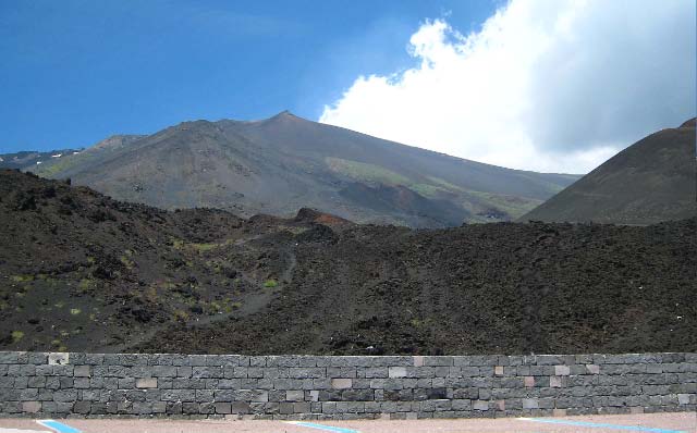 June 11 Above us the ever present Mt Edna loomed, dominating much of the coastline, constantly puffing like an indolent pipe-smoker. We decided to rent a car and have a closer look at Europe's largest volcano. Mt Etna has erupted 130 times over the last 25 centuries. Dramatically standing 2 miles up in Sicilian sky, its foothills are made of ancient lava flows making for a rich and fertile soil that apparently produces excellent wine and citrus fruit. At the summit we found only hostile bare slopes of dark lava, the road leading to the parking lot and a cluster of huts and cafes. |
