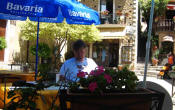 The town of Taormina is a top the hill overlooking the bay. We left our dinghy in the nearby port of Naxos and took a bus up to the stunning Medieval town perched on the rocks 1000 feet above the coast, The center of the village is a maze of steep, narrow streets, white homes with colorful window boxes and now, instead of the typical blue shutters we had been seeing in Greece, dark green shutters. |