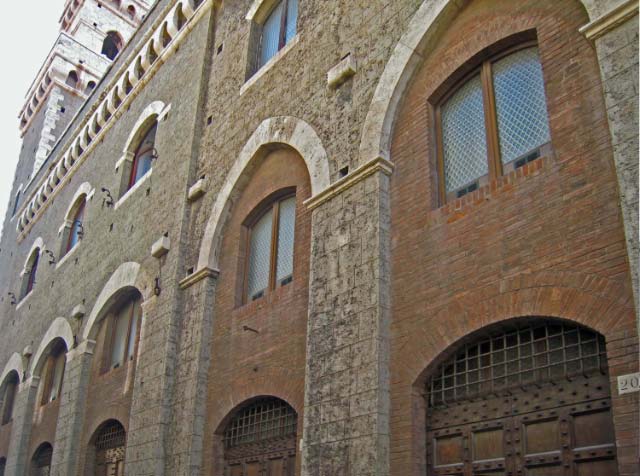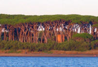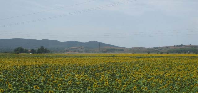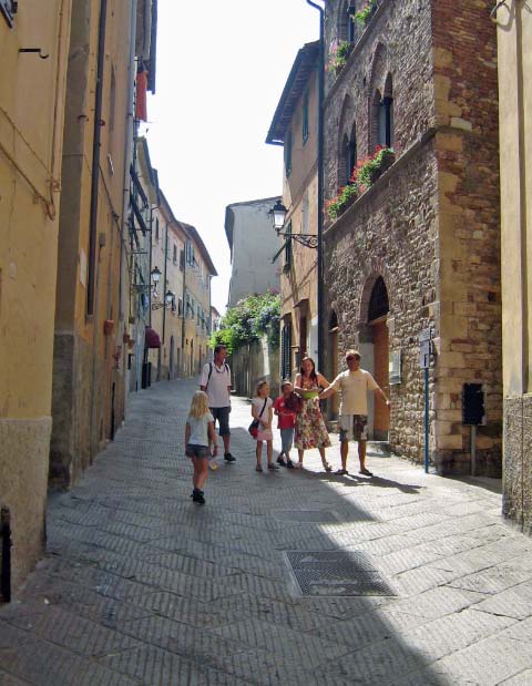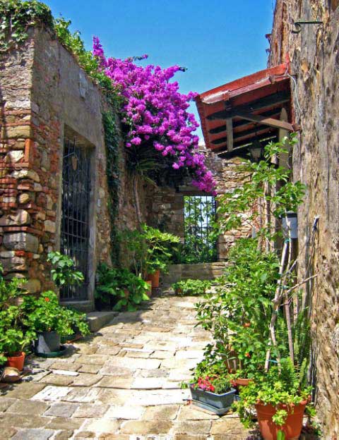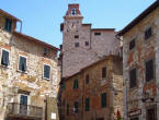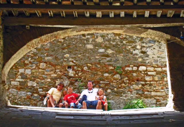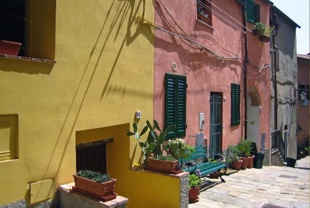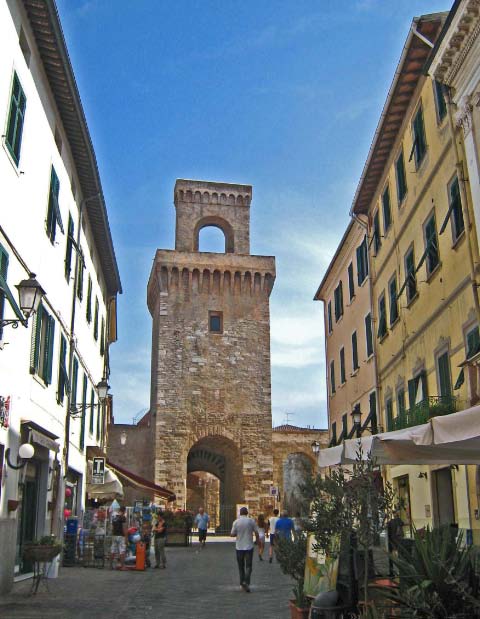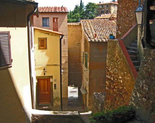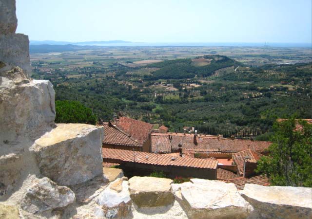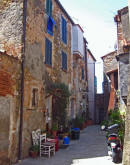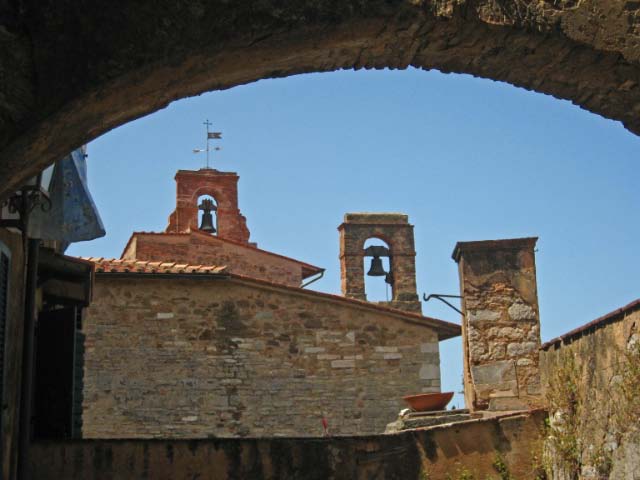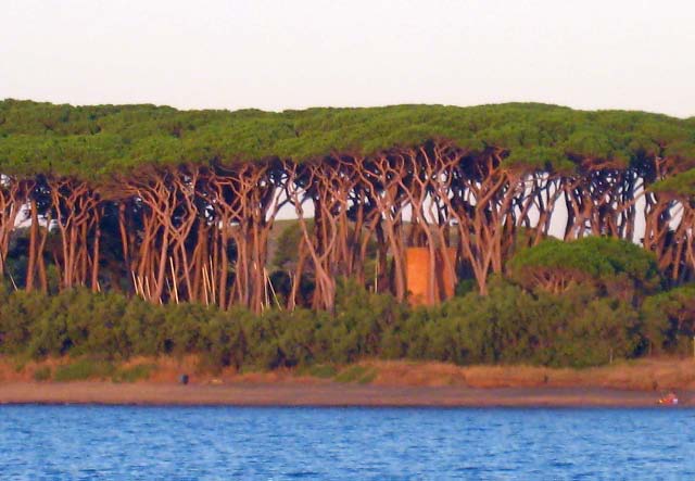 We ended up motoring the entire way to Piombino on Italy mainland and then found a protected anchorage just to the northwest called Port Baratti. There was a campground and a beach ashore with the oddest trees forming an unusual canopy. The water maker and wind generator were still not working. The tap water has not been drinkable so we were getting our water from Grace. Although the Tuscany area is further north than we had planned to sail, we really wanted to visit what represents in our mind, the quintessence of Italy. We hoped to experience some medieval fortified hilltop villages and the lush rolling landscape of the region and the Renaissance art of the cities. We hopped on a bus that took us first into the main port of Piombino, then another bus that took us to a little Medieval town of Campiglia Marittima. |